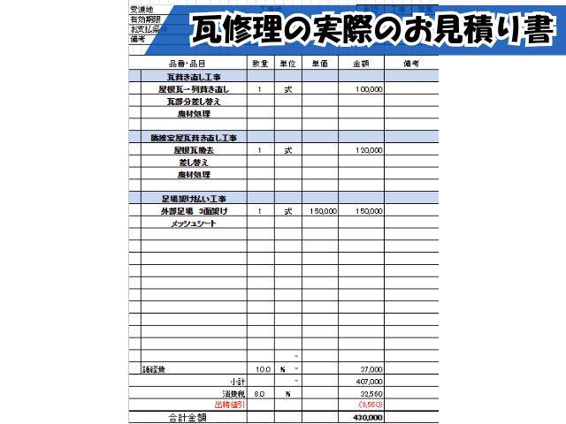 ※上記は30坪前後の瓦屋根・部分葺き直し工事の一例です。状態や範囲によって費用は変動します。