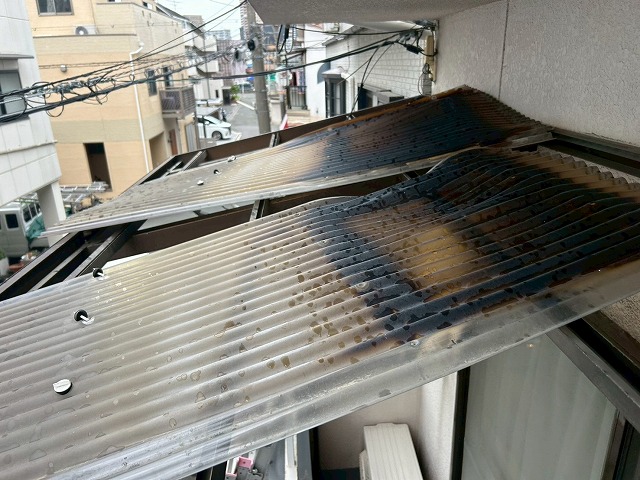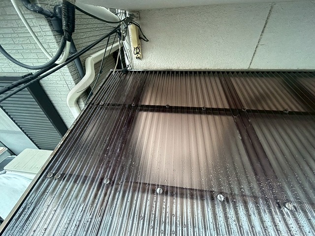 紫外線劣化と経年汚れで波板に黒ずみや割れが発生。ベランダに暗さと雨水の侵入リスクが出ていました。