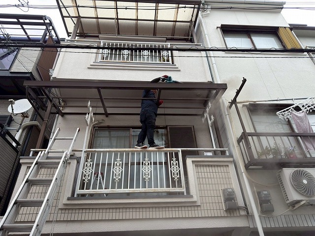 2階ベランダのため脚立・作業足場を用意し、安全を確保して作業を開始。