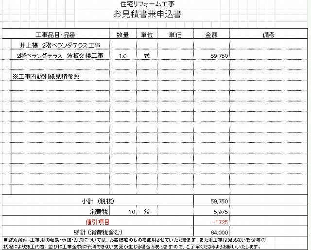 2階ベランダテラス 波板交換工事 | 1.0 | 式 | ― | 59,750円 | ※工事内訳は別紙見積参照 |